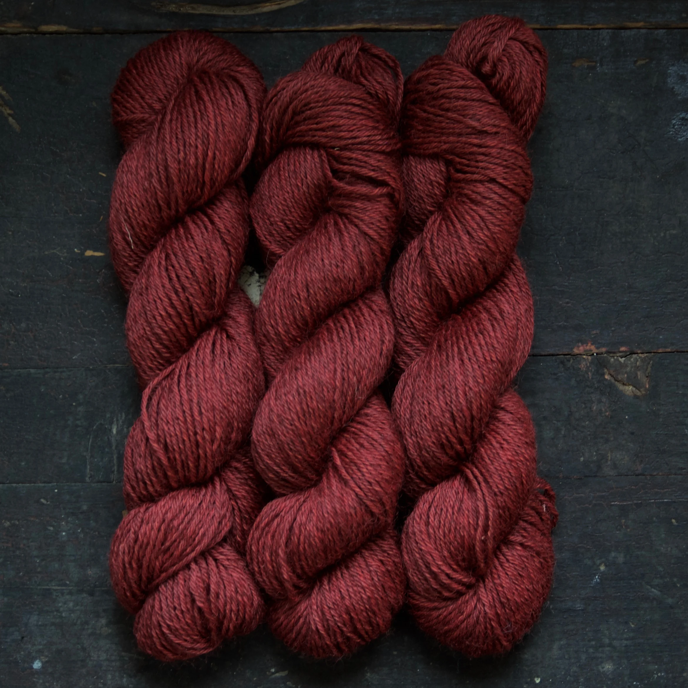 5 Ply Coopworth Gansey Yarn overdyes to lovely, every-so-slightly heathered shades. (Above dyed with indigo, right dyed with madder root).